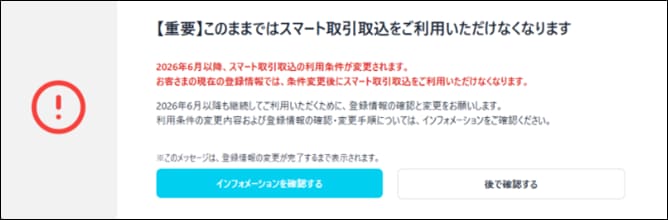 2026年4月22日以降、スマート取引取込を開いた際に、特定の条件下で警告メッセージが表示されるようになります。