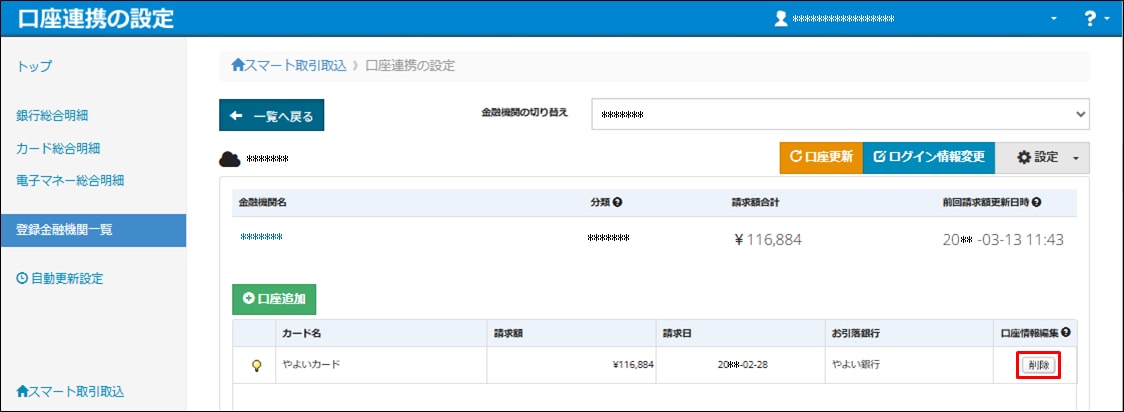 [登録金融機関一覧]から該当するカード名をクリックし、削除したい行の[削除]をクリックします。