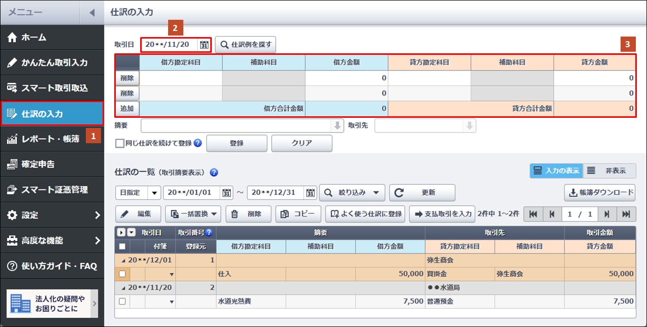 - メニューの[仕訳の入力]をクリックします。 [仕訳の入力]画面が表示されます。