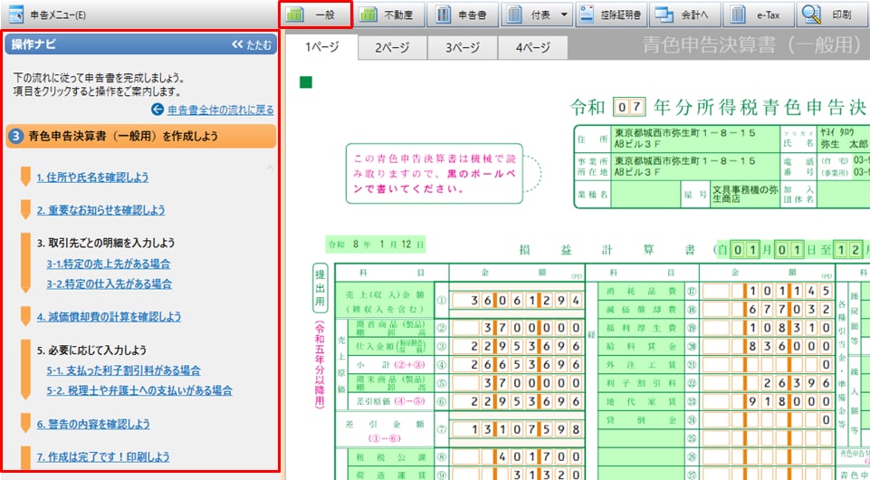 左側の「操作ナビ」の流れにそって、決算書を完成させましょう。