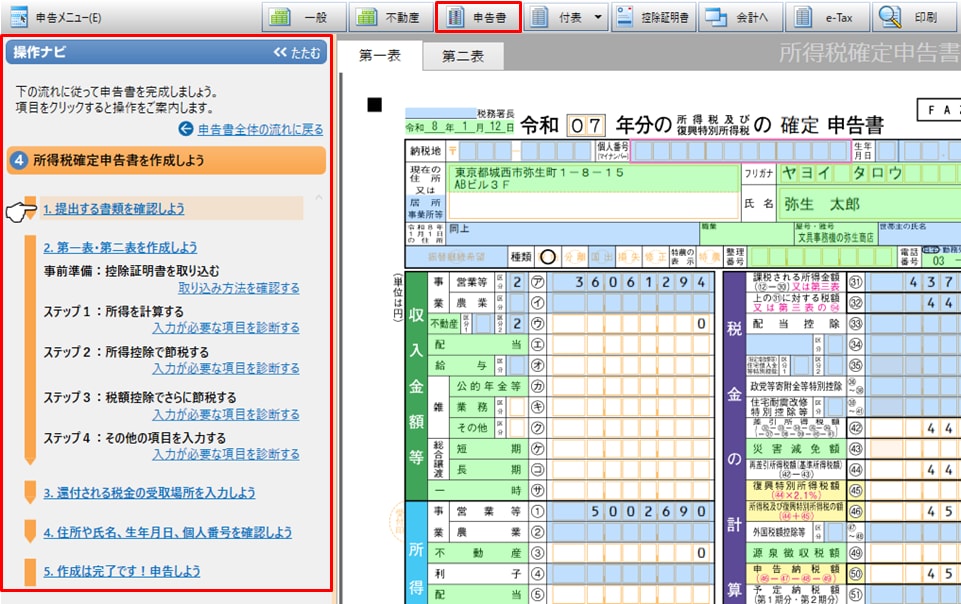 決算書と同様に左側の「操作ナビ」の流れにそって、申告書を完成させましょう。