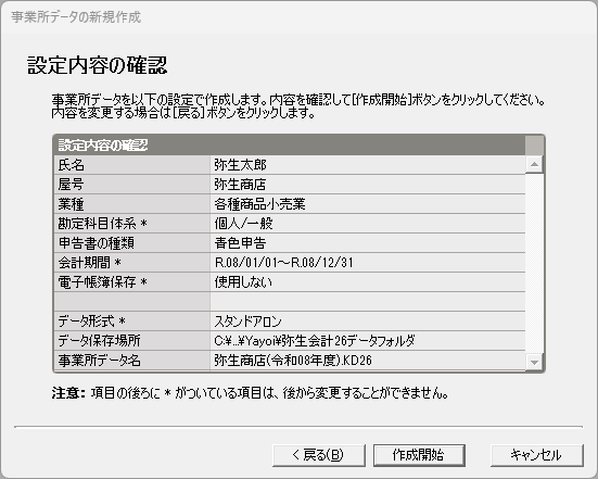 科目体系はデータ作成後に変更することはできません。 - 氏名と屋号(事業所名)を入力します。