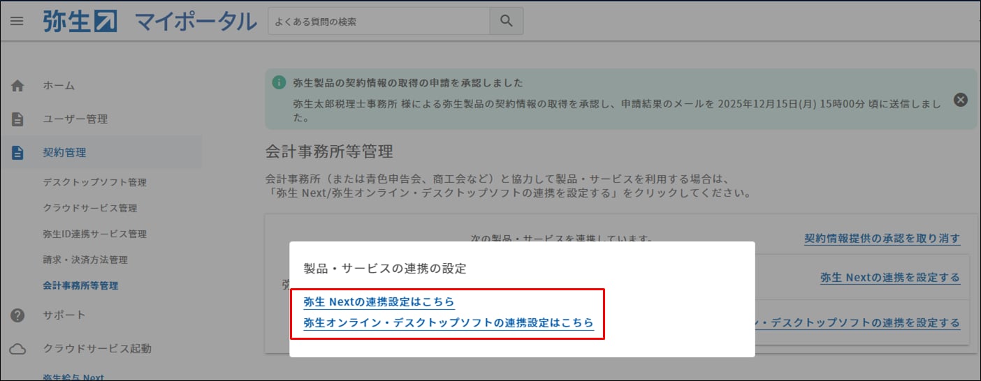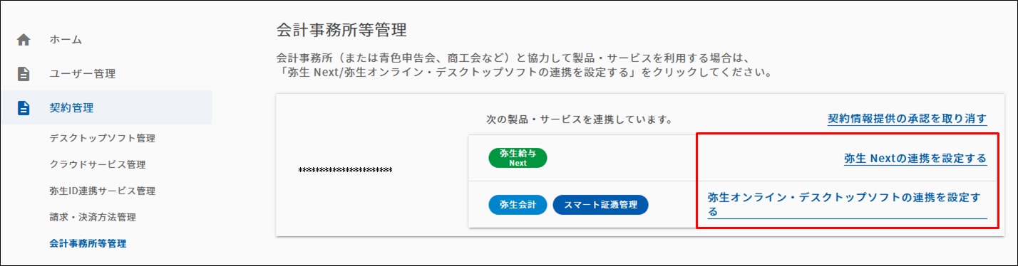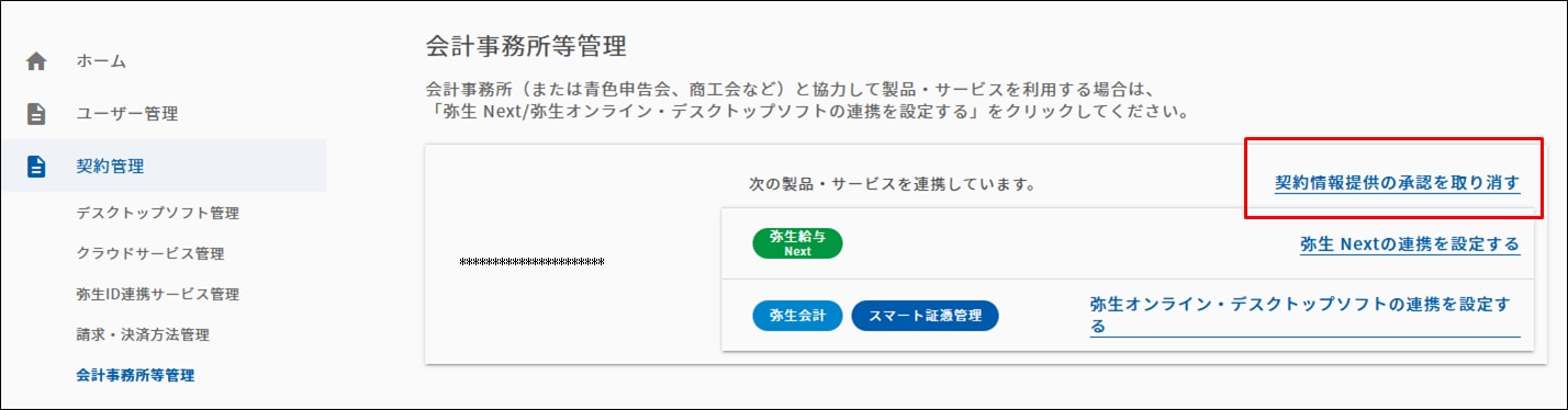 - マイポータル(Web)の[契約管理]-[会計事務所等管理]をクリックします。現在の会計事務所等との製品・サービスの連携状況が表示されます。