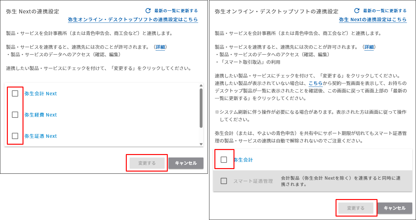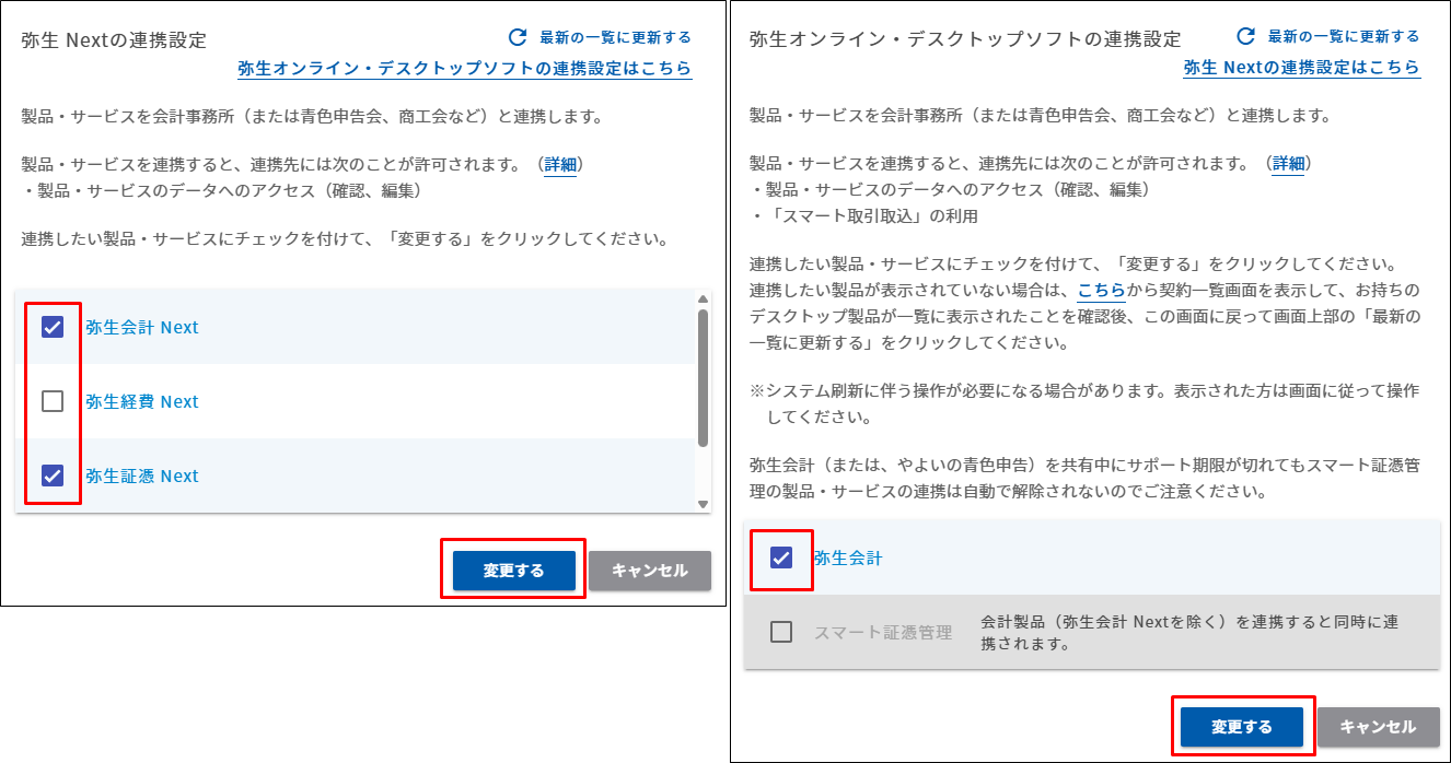 - 連携する製品にチェックを設定し、[変更する]をクリックします。