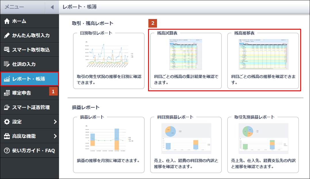 - [残高試算表]または[残高推移表]をクリックします。 [残高試算表]画面または[残高推移表]画面が表示されます。