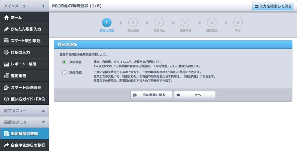 - 画面左下の[高度なメニュー]または[設定メニュー]から[固定資産の登録]をクリックします。
