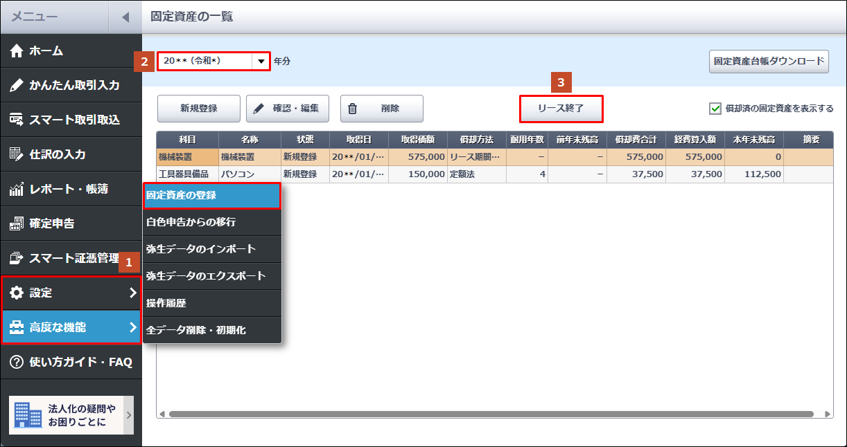 固定資産のリースを終了した場合は、[固定資産の一覧]画面で「リース終了」の処理を行います。