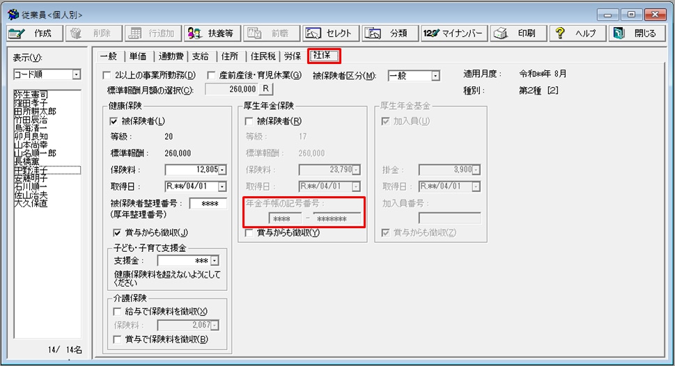 - 基礎年金番号は、[従業員]-[社保]タブの[年金手帳の記号番号]で設定されています。