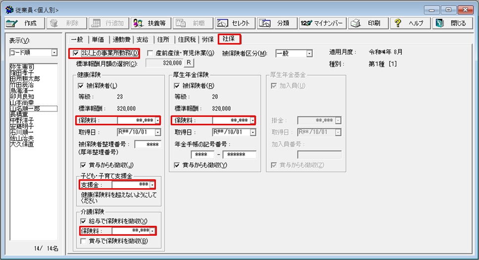※[従業員<個人別>]画面の[社保]タブにある[2以上の事業所勤務]にチェックが入っている従業員は表示されません。