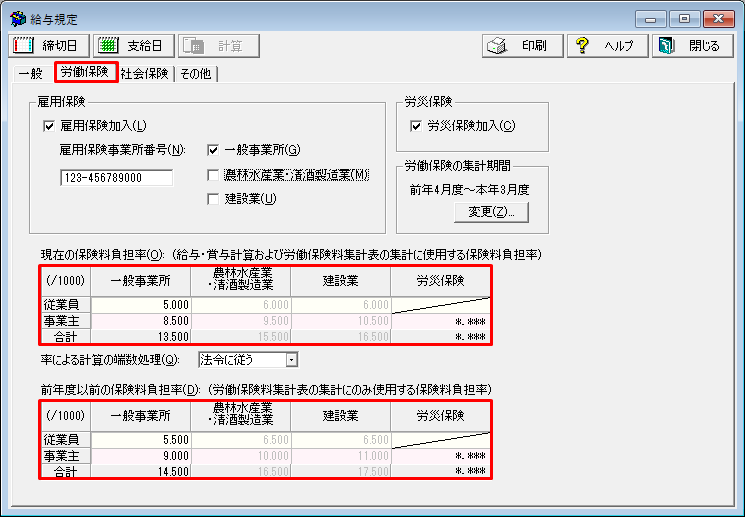 - [労働保険]タブで設定している[現在の保険料負担率]と[前年度以前の保険料負担率]を確認してください。