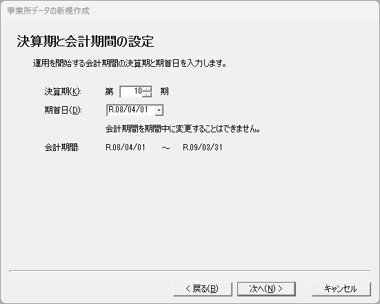 - 決算期、期首日を入力します。本年度から開業する場合は、本年度の期末日から逆算して1年前の日付を期首日に指定してください。