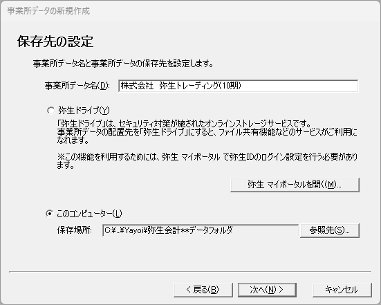 - 事業所データ名を確認し、保存先を選択します。作成するデータを弥生ドライブに保存する場合は、[弥生ドライブ]を選択します。現在のコンピューターに保存する場合は、[このコンピューター]を選択します。[参照先]をクリックすると、保存先を変更することができます。