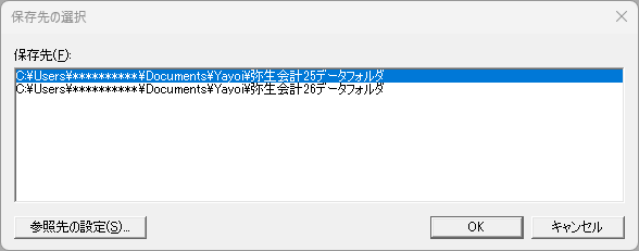 事業所データ名には、自動的に決算期が付けられます。 - 保存先の変更[保存先の選択]画面では、データの保存先をリストから選択します。目的の保存先がない場合は、[参照先の設定]をクリックして目的の保存先をリストに追加します。[参照先の設定]で登録されている保存先が[保存先の選択]に表示されます。