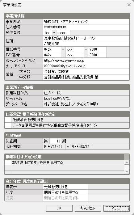 事業所データの作成時に設定した、事業所名や会計年度など、事業所に関する情報を確認、変更できます。また、事業所の住所や電話番号などの情報も設定できます。ここで設定する住所や電話番号は決算書で初期値として表示されます。