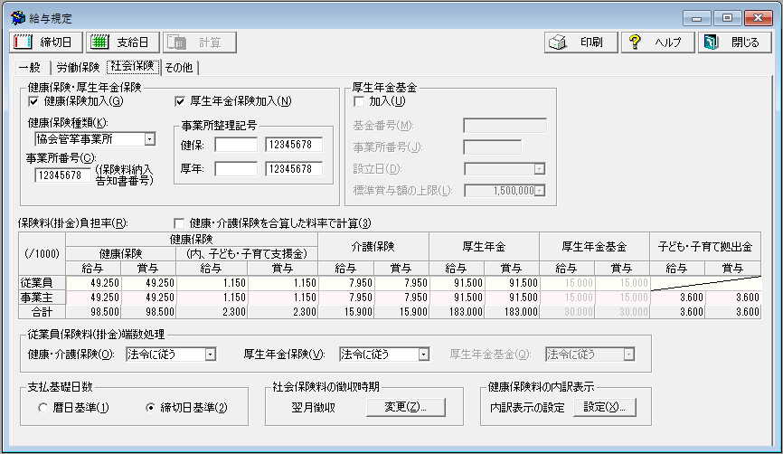 | 保険料(掛金)負担率 | 加入している保険や基金の従業員、事業主の保険料(掛金)負担率を0.000/1000~999.999/1000の範囲で入力します。 |