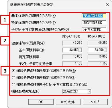 | ③ | 基本保険料、特定保険料、子ども・子育て支援金の端数処理の扱いを設定します。 |