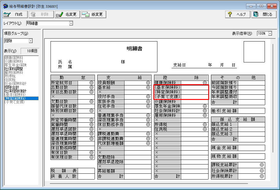 なお、健康保険料の内訳を明細書に表示する場合は、あらかじめ[給与明細書設計]または[賞与明細書設計]画面で、項目グループの[控除]から、明細項目「(基本保険料)」「(特定保険料)」「(子育て支援)」を配置しておく必要があります。