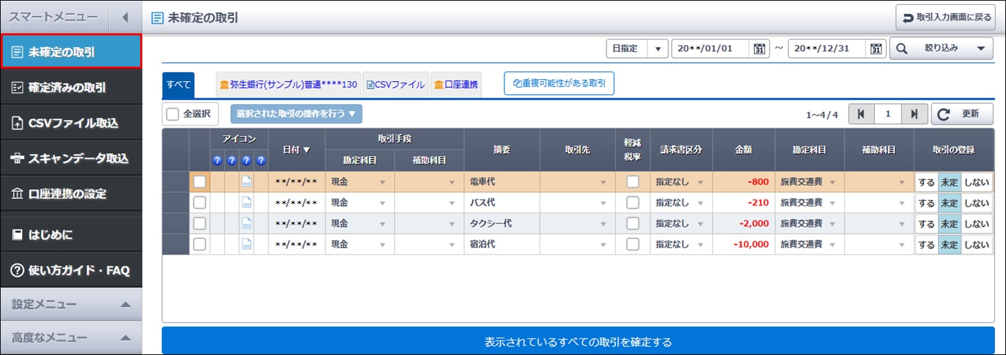 スマート取引取込に取り込まれたデータは、仕訳の学習機能により科目が設定され[未確定の取引]画面に表示されます。