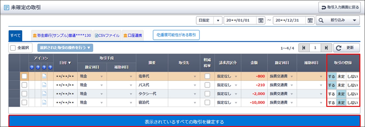 - [取引の登録]を選択して、[表示されているすべての取引を確定する]をクリックします。