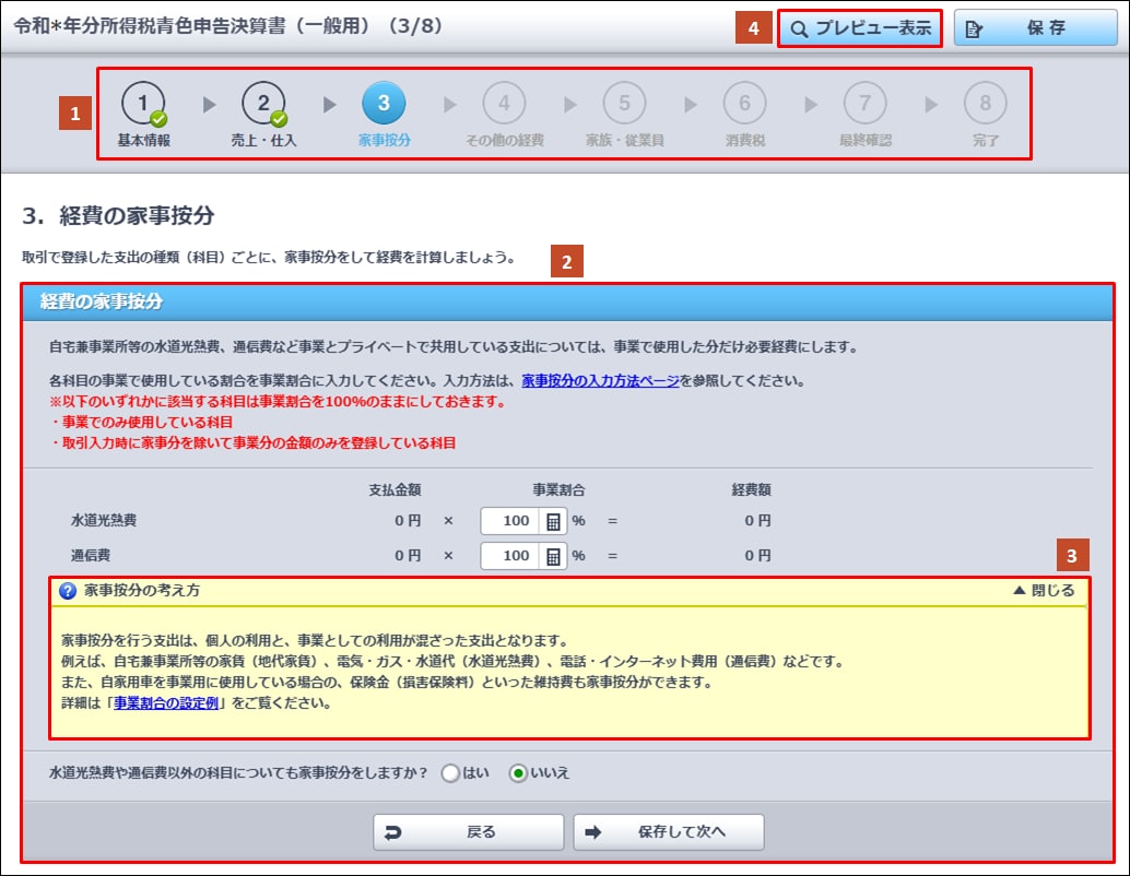 | ④ | プレビュー表示 | クリックすると、入力内容が反映された状態で実際の確定申告書類への印字イメージが表示されます。 |