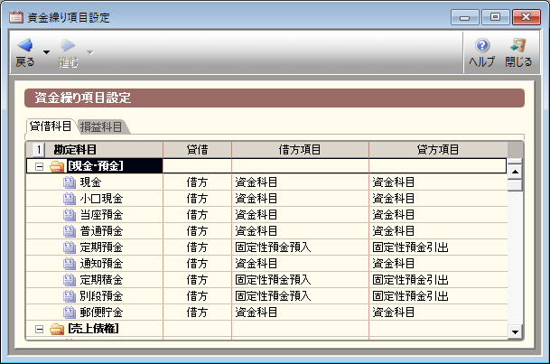 「資金科目」を設定する場合、借方項目、貸方項目ともに「資金科目」を設定してください。借方項目または貸方項目の一方だけに「資金科目」を設定した勘定科目は正しく集計されません。