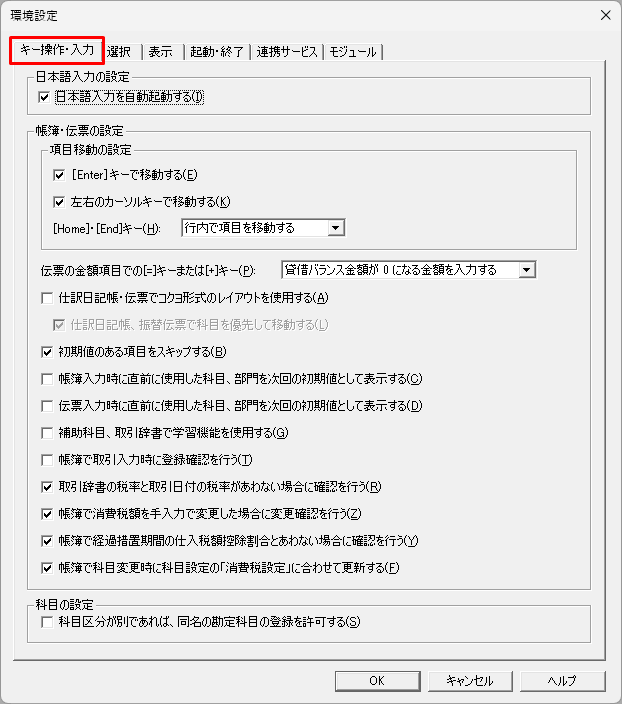 帳簿や伝票の項目移動やキー操作に関する環境設定を行います。