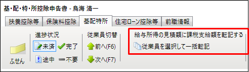 [給与所得の見積額に課税支給額を転記する]の[従業員を選択して一括転記]をクリックします。