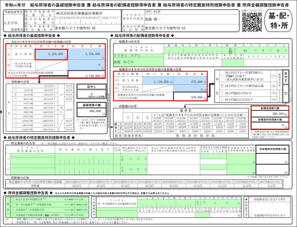 ※基・配・特・所控除申告書の入力方法について詳しくは 基・配・特・所控除申告書を入力する を参照してください。