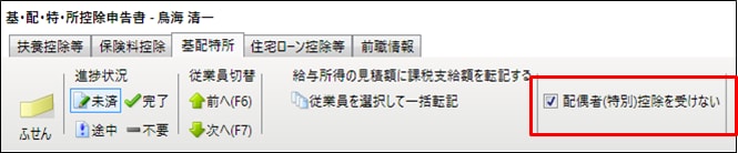 配偶者(特別)控除を受けない場合は、画面上部にある[配偶者(特別)控除を受けない]にチェックを付けます。チェックを付けると、[配偶者(特別)控除の額]が「0円」になります。