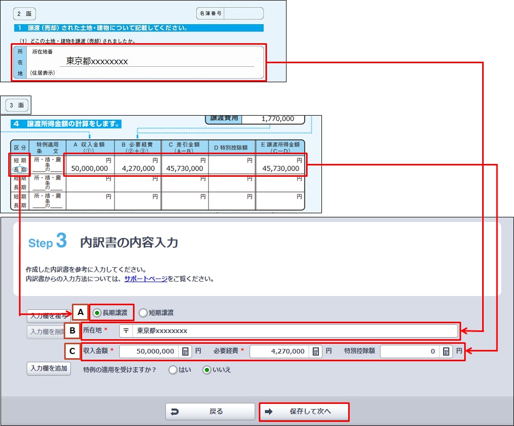 A [長期譲渡][短期譲渡]のどちらかを選択します。 B 「所在地」(譲渡、売却した土地・建物の所在地)を入力します。 C 「収入金額」「必要経費」「特別控除額」を入力します。 - 入力した内容が正しく確定申告書等に反映しているか確認します。画面右上の[プレビュー表示]をクリックします。