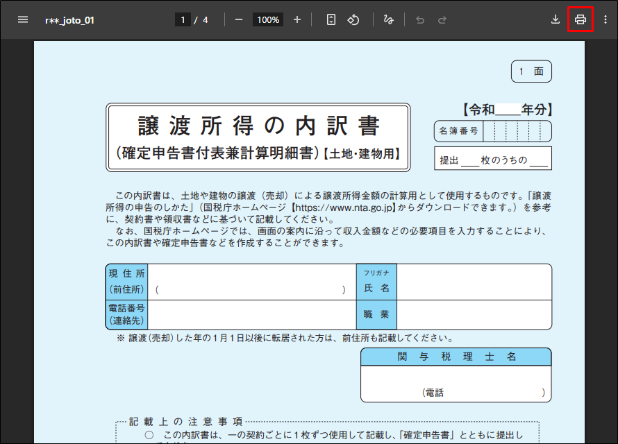 - [印刷]アイコンをクリックして印刷し、手書きで内訳書を作成します。※内訳書は、手引きを確認して作成します。