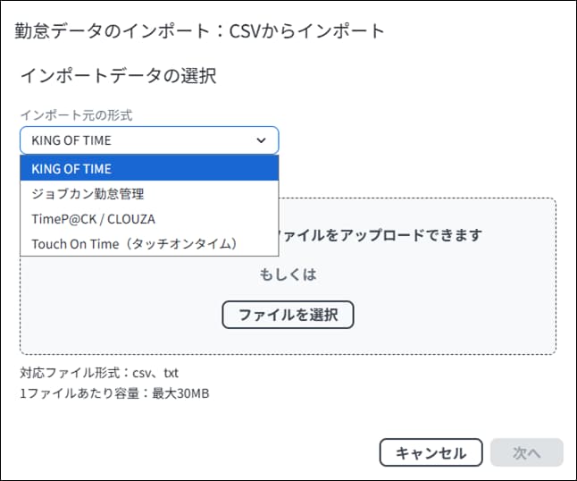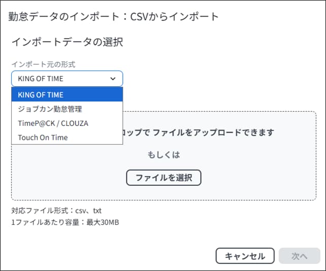 他社が提供している勤怠管理サービスから出力した勤怠データ(CSV)をインポートすることができます。