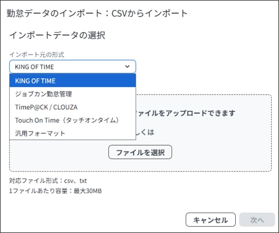 - インポートする勤怠データのファイルをドラッグアンドドロップするか、クリックして表示された画面でファイルを選択して、[次へ]をクリックします。