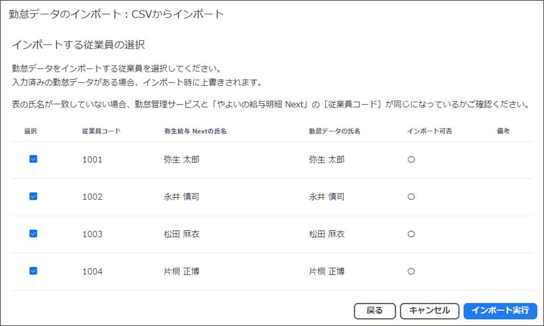 - 既に勤怠データが入力されている従業員を選択すると、インポートするデータで上書きされます。