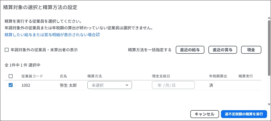 従業員ごとに[精算方法]を給与、賞与、現金から選択します。