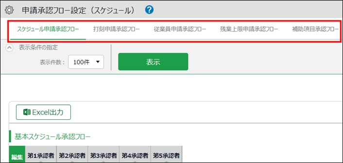 事前に申請承認フロー設定画面をExcel出力することをおすすめします。申請種別ごとに承認フローを分けるように設定変更すると、承認フローが初期状態に戻ってしまうためです。出力したExcelデータは、申請種別ごとに承認フローを設定する際にご参照ください。