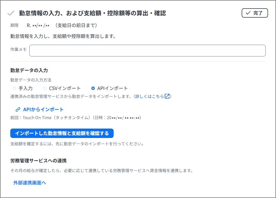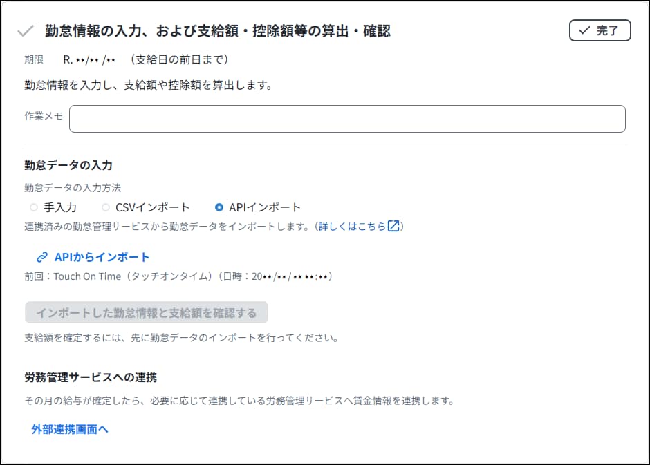 やることリストの「勤怠情報の入力、および支給額・控除額等の算出・確認」で、「勤怠データの入力方法」から「APIインポート」を選択します。