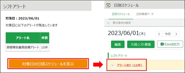目標人数と予定されている人数に差異がある場合や、従業員の希望勤務時間とスケジュール予定に差異がある場合、「日別スケジュール画面」、「日別業務データ画面」、「スケジュール管理画面」にシフトアラートが表示されます。