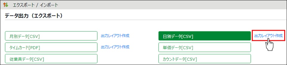 - データ出力(エクスポート)カテゴリ内の、[月別データ[CSV]]または[日別データ[CSV]]、[タイムカード[PDF]]の隣にある「出力レイアウト作成」をクリックします。