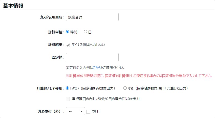 項目名 説明 カスタム項目名 項目の名称を、100文字以内で入力します。 計算単位 計算単位を選択します。 - 時間:労働時間に関する項目作成時に選択します。