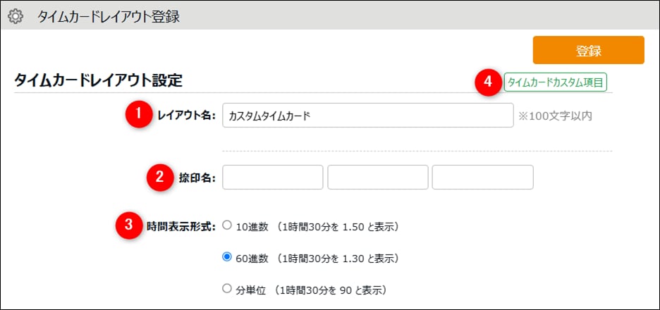 番号 項目名 説明 1 レイアウト名 任意のレイアウト名を100文字以内で入力します。 2 捺印名 捺印欄に表示する名称を9文字以内で入力します。捺印欄は3枠あります。 3 時間表示形式 時間の出力形式を「10進数」「60進数」「分単位」から選択します。 4 タイムカードカスタム項目 タイムカードカスタム項目画面を開きます。既存の勤怠項目を組み合わせたオリジナル項目を作成したい場合はこちらから設定可能です。