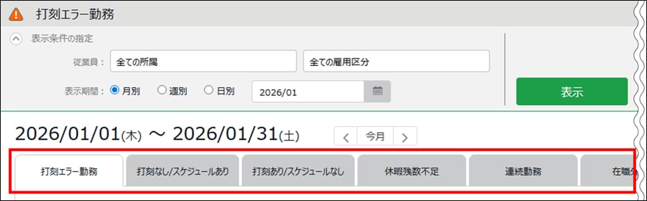| 当日まで | 当日までの期間でエラー勤務をチェックします。翌日以降はチェック対象外です。 |