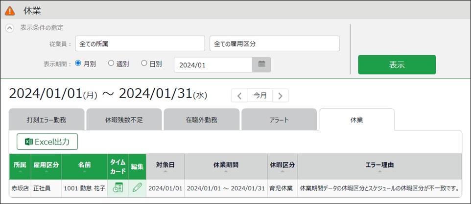 ※全メニュー > エラー勤務 > [休業]タブからも確認可能です。 - エラー理由「休業期間データの休暇区分とスケジュールの休暇区分が不一致です。」と表示された場合、育児休業の取得期間に対して、以下いずれかの操作がされたことが考えられます。
