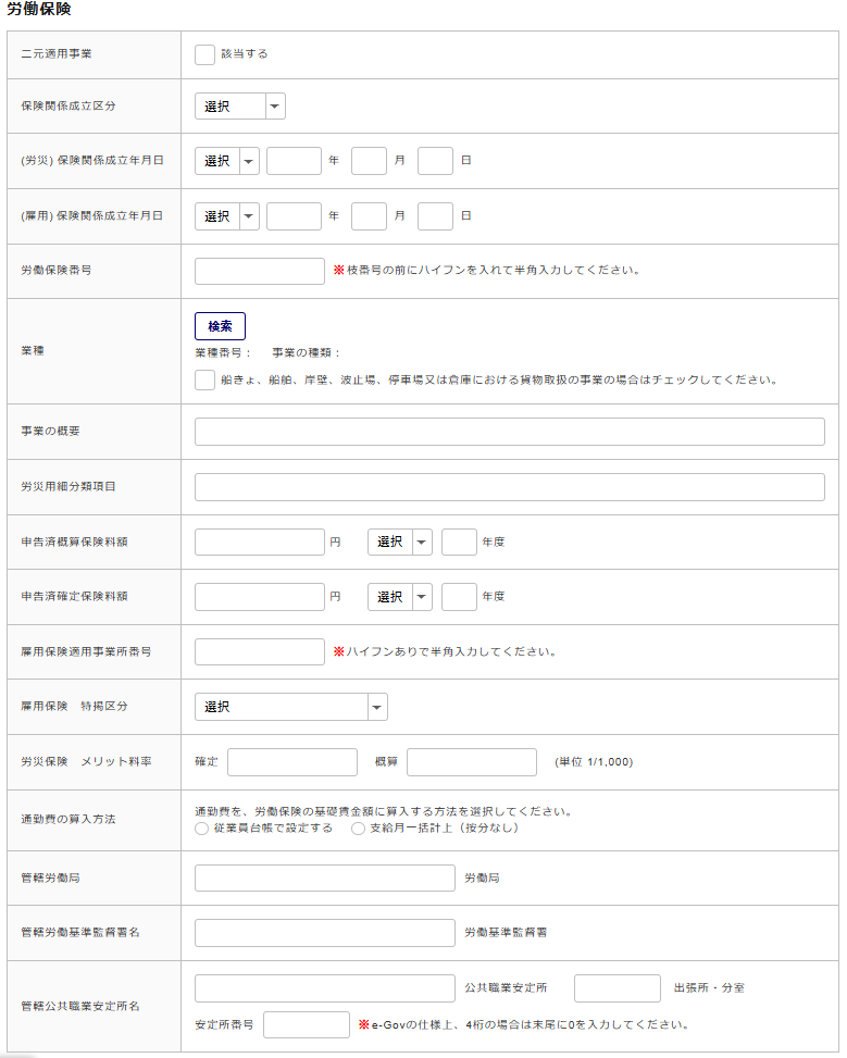 | 雇用保険適用事業所番号 | 上2桁(都道府県番号)に対応する都道府県が帳票申請時の提出先選択に反映されます。 |
