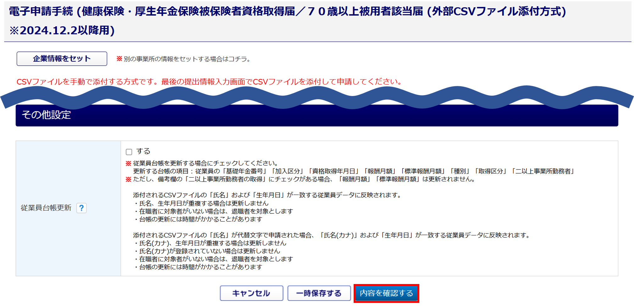 [電子申請 添付用CSV作成]で作成したCSVファイルを用いて電子申請をおこなう方法について、ご説明します。