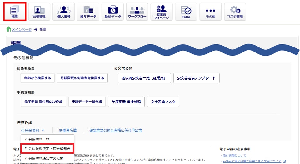 [帳票]>その他機能[社会保険料]>[社会保険料決定・変更通知書]をクリックします。