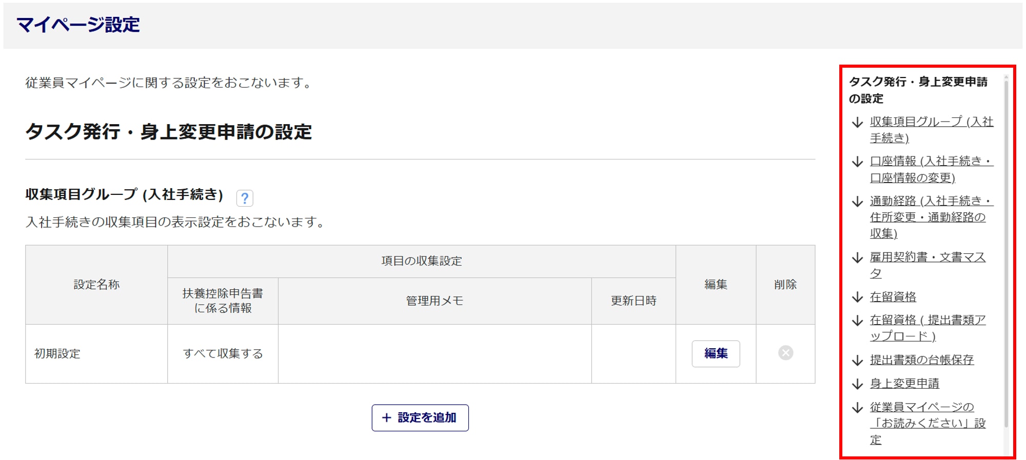 入社手続き時に収集する情報の範囲(扶養控除申告書、口座情報や通勤経路を含むかについて)、身上変更申請の「表示/非表示」などを設定することができます。
