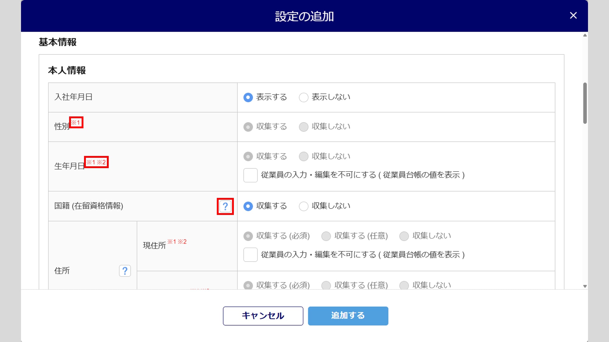 ※項目右横の[(はてなマーク)]をクリックすると、入社手続きタスクの入力画面の該当項目を確認できます。選択肢 説明 表示する 入社手続きタスク発行時に、従業員台帳の情報を該当項目に表示します。 表示しない 入社手続きタスク発行時に、該当項目を表示しません。 収集する 入社手続きタスク発行時に従業員の入力画面や提出書類アップロード画面に該当項目が表示されます。