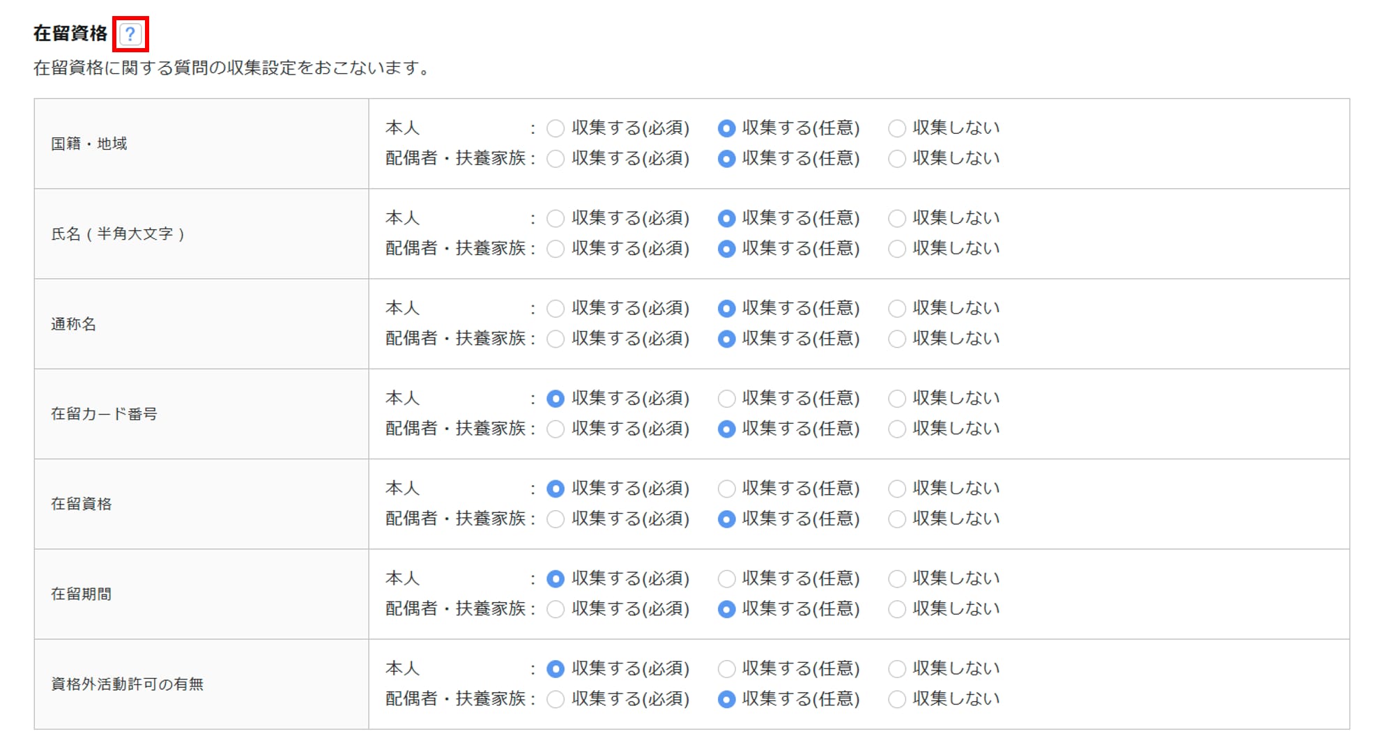 入社手続き、身上変更、在留資格の更新タスクでの在留資格に関する質問項目に対して、情報を収集するかについて設定します。