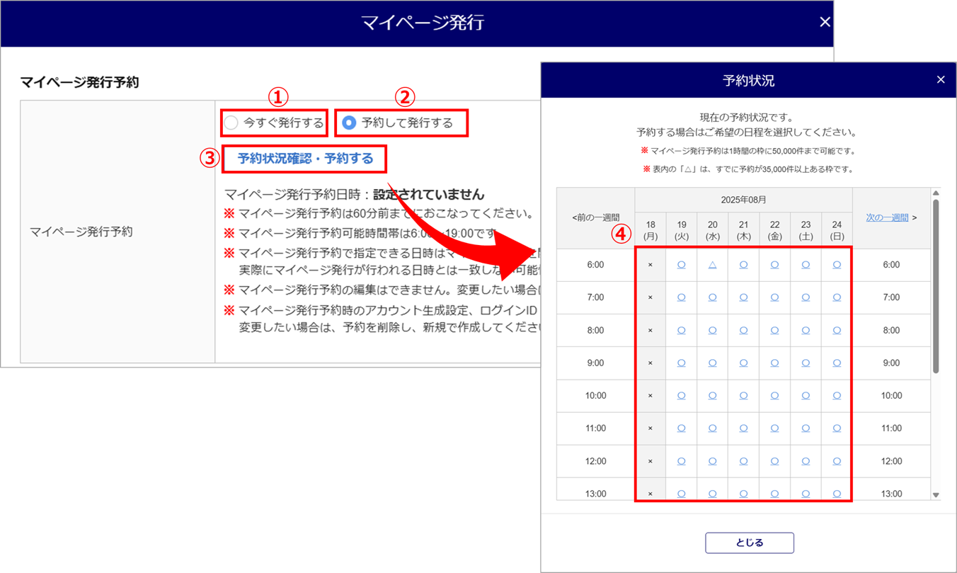予約して発行する場合、「予約して発行する」(②)を選択後、[予約状況確認・予約する](③)をクリックし、予約する日時(④)をクリックします。マイページ発行予約で指定できる日時はマイページ発行を開始する日時です。